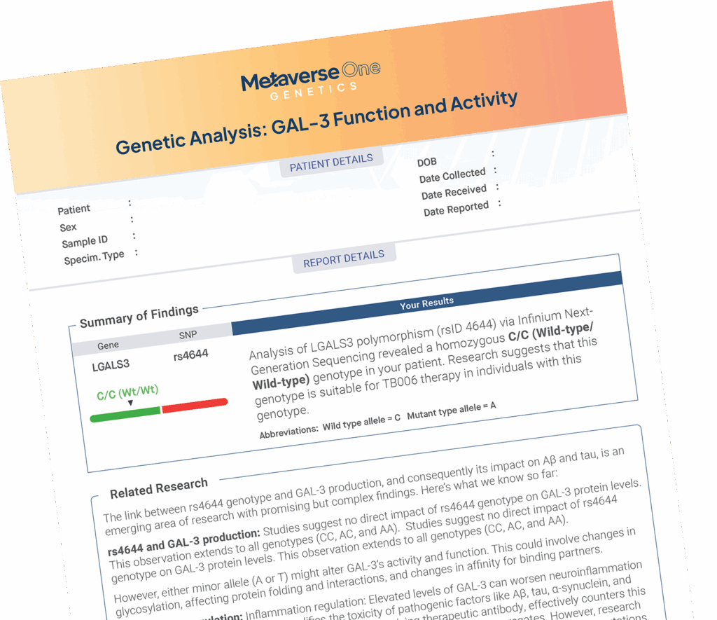 Unlock insights that help guide your approach to dementia-related treatments. Check your LGALS3 gene and see if TB006 therapy may be right for you.
